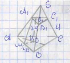 Даны стороны оснований правильной треугольной усечённой пирамиды \(a=30\) см и \(b=24\) см, боковое ребро \(l=4\) см.