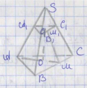 Апофема, высота и разность радиусов связаны прямоугольным треугольником, где гипотенуза — апофема \(l\), а катеты — высота \(h\) и разность радиусов \(r_2 — r_1\). Значит, по теореме Пифагора: \(l^2 = h^2 + (r_2 — r_1)^2\). Подставляя известные значения, получаем \(2^2 = h^2 + (\sqrt{3})^2\), то есть \(4 = h^2 + 3\). Решая уравнение, находим \(h^2 = 1\), откуда высота пирамиды \(h = 1\) см.