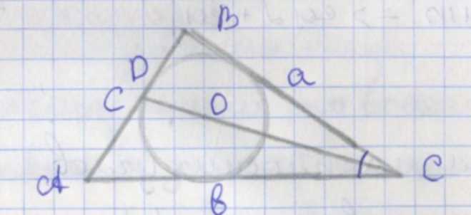 Чтобы найти отношение отрезков \(CO\) и \(OD\), рассмотрим свойства вписанной окружности и биссектрисы. Известно, что биссектриса делит противоположную сторону \(AB\) в отношении, равном отношению прилегающих сторон, то есть \(AD : DB = AC : BC\). Обозначим стороны так: \(AB = c\), \(BC = a\), \(AC = b\). Тогда длины отрезков на стороне \(AB\) связаны с \(a\), \(b\), \(c\).