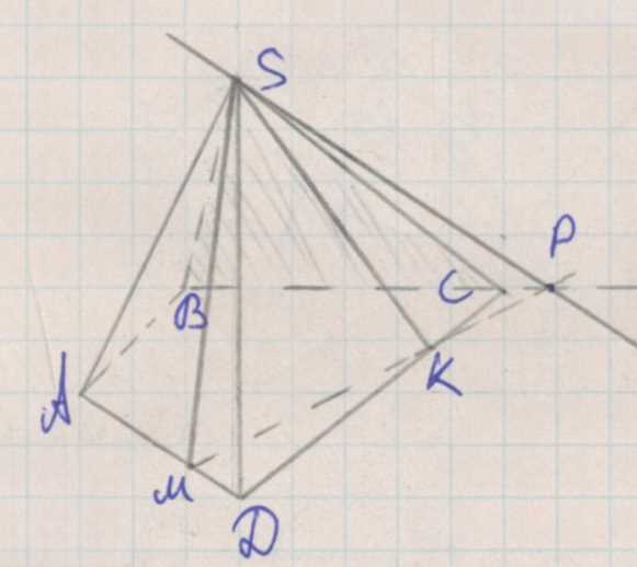 2. Рассмотрим плоскость \(MSK\), которая определяется тремя точками \(M\), \(S\) и \(K\), где \(M\) и \(K\) лежат на рёбрах \(AD\) и \(CD\) соответственно.