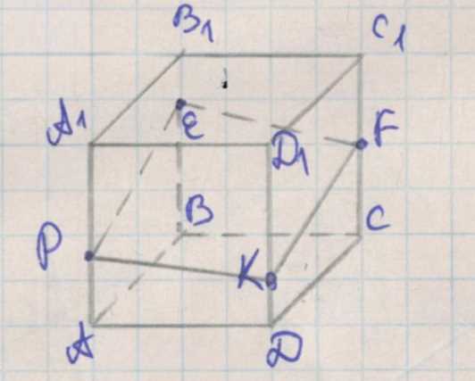 Для построения сечения найдём пересечения плоскости \(EFK\) с рёбрами \(AB\) и \(AD\). Обозначим точку пересечения с ребром \(AD\) как \(P\).