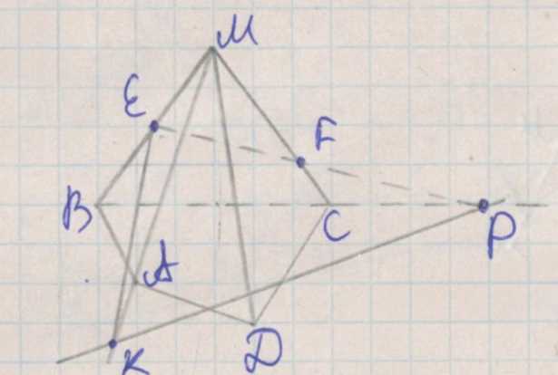 Точки \(E\) и \(F\) лежат на рёбрах \(MB\) и \(MC\), точка \(K\) — на продолжении ребра \(MA\).