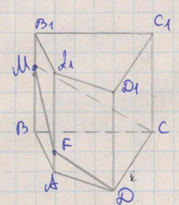 На ребре \(AB\) находим точку пересечения \(F\) с плоскостью \(CMD\). Сечение проходит через точки \(M, F, D, D_1, C\).