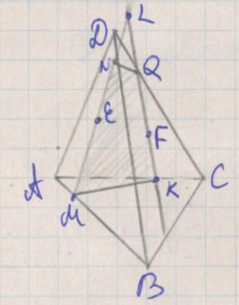 10. Ответ: сечение тетраэдра плоскостью, проходящей через точки \(E\), \(F\), \(K\), — четырёхугольник \(EFKQ\), где \(Q\) — точка пересечения плоскости с ребром \(DB\).