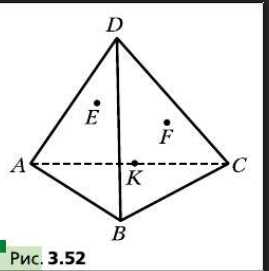 Точка \(K\) принадлежит ребру \(AC\) тетраэдра \(DABC\), точка \(E\) — грани \(ADB\), точка \(F\) — грани \(BDC\) (рис. 3.52). Постройте сечение тетраэдра плоскостью \(EFK\).