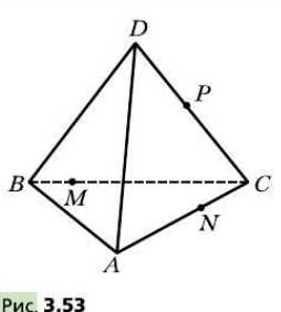 На рёбрах \(BC\), \(CA\) и \(CD\) тетраэдра \(DABC\) отметили точки \(M\), \(N\) и \(P\) соответственно (рис. 3.53). Постройте точку пересечения плоскостей \(ABP\), \(ADM\) и \(BDN\).
