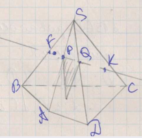 6. Проверяем принадлежность точек к ребрам пирамиды: \(F \in ASB\), \(P \in SB\), \(M \in ASD\), \(K \in DSC\), \(Q \in DC\).