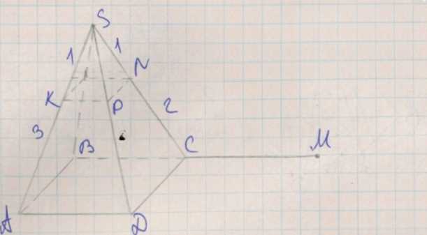 Точки \(K\) и \(N\) делят ребра \(SA\) и \(SC\) в отношении \(1:3\) и \(1:2\) соответственно. Точка \(M\) лежит на продолжении \(BC\) так, что \(BC = CM\).