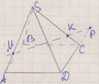 4. Прямая \(MK\) пересекает плоскость \(ABC\) в некоторой точке \(P\). Поскольку \(M\) лежит на \(SA\), а \(K\) на \(SC\), то прямая \(MK\) находится в пространстве между этими рёбрами.