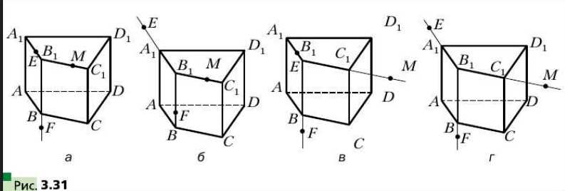 Дана призма \(ABCDA_1B_1C_1D_1\) (рис. 3.31). Точка \(E\) принадлежит прямой \(A_1B_1\), точка \(F\) — прямой \(BB_1\), точка \(M\) — прямой \(B_1C_1\). Постройте сечение призмы плоскостью \(EFM\).