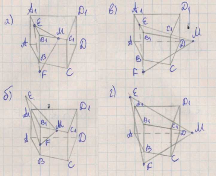 Получаем многоугольник с вершинами \(E\), \(F\), \(M\), а также точками пересечения с указанными рёбрами.