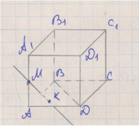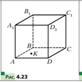На грани \( ADD_1 \) куба \( ABCDA_1B_1C_1D_1 \) отметили точку \( K \) (рис. 4.23). Постройте точку, в которой прямая, проходящая через точку \( K \) параллельно прямой \( DB \), пересекает плоскость \( ABB_1 \).