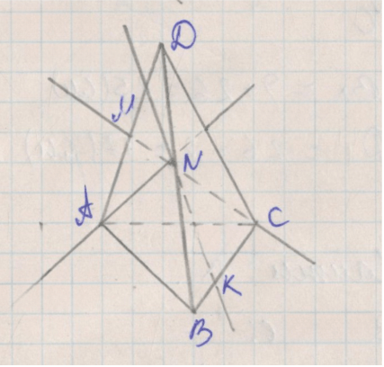 1. Рассмотрим тетраэдр \( DABC \). На рёбрах \( AD \), \( BD \), \( BC \) отмечены точки \( M \), \( N \), \( K \) соответственно, то есть \( M \in AD \), \( N \in BD \), \( K \in BC \).