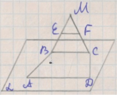 3) Из двух предыдущих утверждений следует, что \( EF \parallel BC \) и \( BC \parallel AD \). По свойству параллельных прямых, если две прямые параллельны третьей, то они параллельны друг другу. Значит, \( EF \parallel AD \).