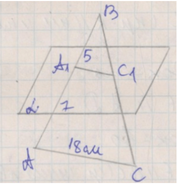Плоскость \( \alpha \), параллельная стороне \( AC \) треугольника \( ABC \), пересекает стороны \( AB \) и \( BC \) в точках \( A_1 \) и \( C_1 \) соответственно (рис. 5.18). Найдите отрезок \( A_1C_1 \), если \( AC = 18 \) см и \( AA_1 : A_1B = 7 : 5 \).