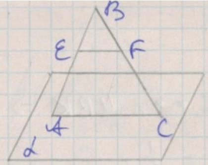 Дано: \( AC \subset \alpha \), \( A, C \in \alpha \), \( B \notin \alpha \), точки \( E \) и \( F \) на \( AB \) и \( BC \) соответственно, причем \(\frac{BA}{BE} = \frac{BC}{BF}\).