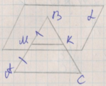 2. Прямая \( \alpha \), проходящая через \( M \) и параллельная стороне \( AC \), пересекает сторону \( BC \) в точке \( K \). По признаку средней линии в треугольнике \( ABC \), отрезок \( MK \), соединяющий середину \( AB \) с точкой на \( BC \), параллелен \( AC \), следовательно, \( K \) — середина \( BC \).