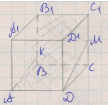 1) Рассмотрим плоскость \( ADM \). Она проходит через точки \( A \), \( D \) и \( M \). Точка \( M \) лежит на ребре \( CC_1 \), которое принадлежит плоскости \( BB_1C_1 \). Плоскость \( BB_1C_1 \) задана точками \( B \), \( B_1 \), \( C_1 \). Чтобы найти линию пересечения плоскостей \( ADM \) и \( BB_1C_1 \), нужно найти две точки, принадлежащие обеим плоскостям. Точка \( M \) уже принадлежит обеим плоскостям, так как \( M \in CC_1 \subset BB_1C_1 \). Теперь найдём вторую точку пересечения. Рассмотрим ребро \( AD \), оно принадлежит плоскости \( ADM \). Найдём точку \( K \), где \( AD \) пересекает плоскость \( BB_1C_1 \). Так как \( AD \) — отрезок между вершинами \( A \) и \( D \), проверим, лежат ли эти точки в плоскости \( BB_1C_1 \). Точки \( A \) и \( D \) не лежат в плоскости \( BB_1C_1 \), но отрезок \( AD \) пересекает эту плоскость в точке \( K \). Тогда линия пересечения — это отрезок \( KM \).
