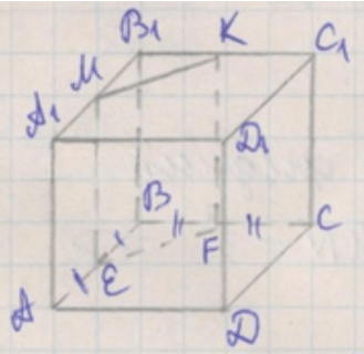 6. Сечение куба плоскостью — параллелограмм \( EFKM \) с вершинами \( E, F, K, M \).