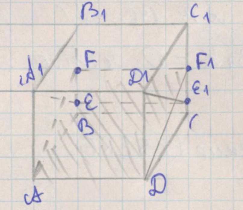 5. Рассмотрим пересечение плоскости \(AFD\) с ребром \(C_1D_1\). Пусть точка пересечения – \(F_1\). Она лежит на ребре \(C_1D_1\) и принадлежит плоскости \(AFD\).