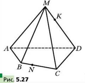 Дана пирамида \(MABCD\) (рис. 5.27). На ребре \(BC\) отметили точку \(N\), на ребре \(MD\) — точку \(K\). Постройте сечение пирамиды плоскостью, проходящей через точки \(N\) и \(K\) параллельно прямой \(CD\).