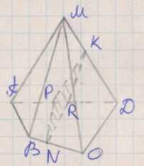 Плоскость проходит через точки \(N\) и \(K\), а также параллельна прямой \(CD\). Через \(N\) проводим прямую, параллельную \(CD\), она пересекает ребро \(AB\) в точке \(P\). Через \(K\) проводим прямую, параллельную \(CD\), она пересекает ребро \(MA\) в точке \(R\). Сечение пирамиды — четырёхугольник \(NPKR\).
