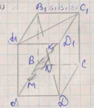 Пусть \(M\) — середина ребра \(AB\). Плоскость проходит через \(M\) и параллельна прямым \(A_1C_1\) и \(BD_1\). Поскольку \(A_1C_1\) и \(BD_1\) пересекаются в точке \(K\) на ребре \(BB_1\), а также на ребре \(DD_1\) в точке \(N\), секущая плоскость пересечёт диагональ \(DB_1\).