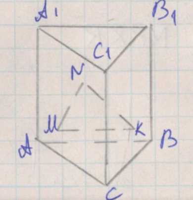 6. Аналогично, отметим точки пересечения плоскости \(MNK\) с нижними основаниями призмы: \(MN\) пересекает \(AB\) в точке \(M_1\), \(NK\) пересекает \(BC\) в точке \(K_1\), \(KM\) пересекает \(CA\) в точке \(N_1\).