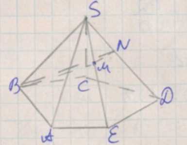 1. По условию на рёбрах \(SE\) и \(SD\) отмечены точки \(M\) и \(N\) так, что \(\frac{SM}{SE} = \frac{SN}{SD}\). Это значит, что точки \(M\) и \(N\) делят рёбра \(SE\) и \(SD\) в одинаковом отношении.