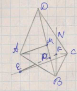 2. Находим точку \( F \) как пересечение \( BN \) и \( CP \), где \( C \) — вершина тетраэдра.