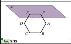 Вершины \( E \) и \( F \) правильного шестиугольника \( ABCDEF \) лежат в плоскости \( \alpha \), отличной от плоскости шестиугольника (рис. 5.15). Каково взаимное расположение плоскости \( \alpha \) и прямой: 1) \( BC \); 2) \( AB \); 3) \( BD \); 4) \( AD \)?