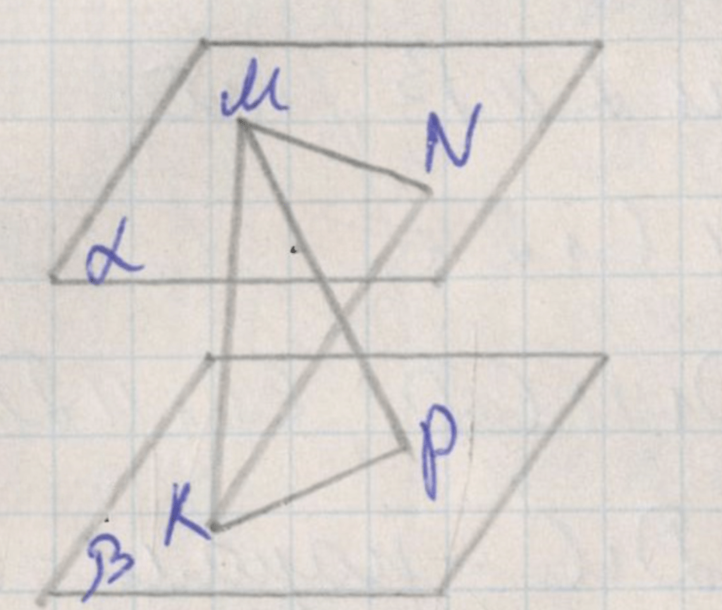 1. Точки \( M \) и \( N \) лежат в плоскости \( \alpha \), а точки \( K \) и \( P \) — в параллельной плоскости \( \beta \).