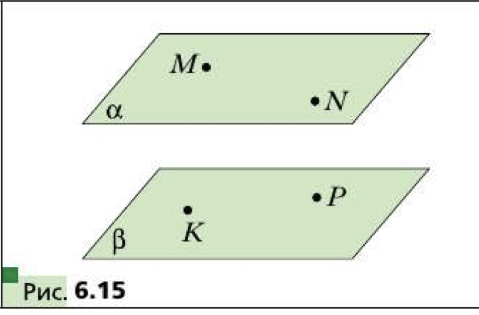 Даны параллельные плоскости \(\alpha\) и \(\beta\). Точки \(M\) и \(N\) лежат в плоскости \(\alpha\), точки \(K\) и \(P\) — в плоскости \(\beta\) (рис. 6.15). Постройте линию пересечения: