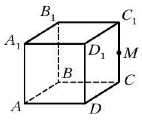 1. Точка \(M\) — середина ребра \(CC_1\). Если принять куб с ребром \(a\) и координатами вершин так, что \(C = (a, a, 0)\), \(C_1 = (a, a, a)\), то координаты точки \(M\) будут \(M = (a, a, \frac{a}{2})\).