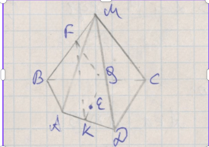 4. Точки \(K\) и \(F\) находятся как пересечения проведённой через \(E\) прямой с рёбрами \(MA\) и \(MB\).