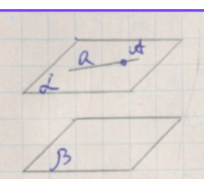 4. Если бы прямая \( a \) не лежала в плоскости \( \alpha \), то она пересекала бы плоскость, проходящую через \( A \) и параллельную \( \beta \), что невозможно.