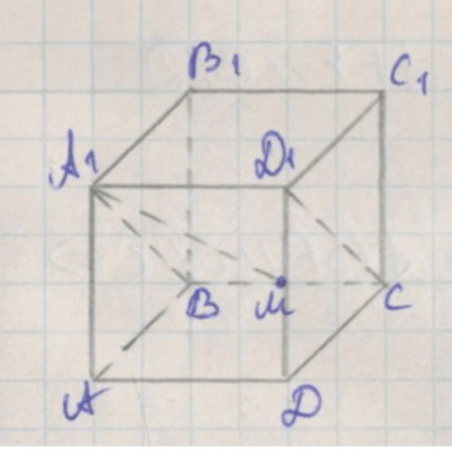 1. Дано куб \( ABCDA_1B_1C_1D_1 \). Точка \( M \) — середина ребра \( BC \), значит координаты \( M \) находятся на отрезке между точками \( B \) и \( C \), то есть \( M = \frac{B + C}{2} \).