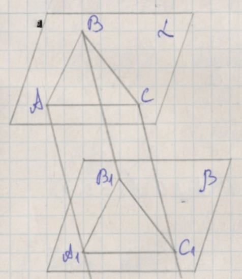 Треугольники лежат в параллельных плоскостях, а прямые через вершины \(A, B, C\) параллельны. Значит, \(AB \parallel A_1B_1\), \(AC \parallel A_1C_1\), \(BC \parallel B_1C_1\).
