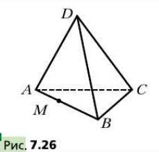 На рисунке 7.26 изображён тетраэдр \( DABC \), на ребре \( AB \) которого отметили точку \( M \). Постройте образ данного тетраэдра при симметрии относительно: 1) вершины \( A \); 2) точки \( M \).