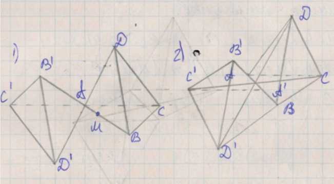 9) Таким образом, тетраэдр \(DABC\) преобразуется в тетраэдр \(D’A’B’C’\), где \(A’ = B\), \(B’ = A\), \(C’ = 2M — C\), \(D’ = 2M — D\).