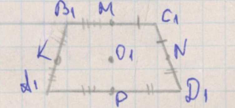 Построение: из центра \( O_1 \) опускаем перпендикуляры на стороны трапеции \( A_1B_1, B_1C_1, C_1D_1, D_1A_1 \). Точки пересечения — точки касания: \( M \) на \( B_1C_1 \), \( P \) на \( D_1A_1 \), \( K \) на \( A_1B_1 \), \( N \) на \( C_1D_1 \).