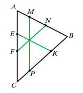 Рассмотрим треугольник \(ABC\). Пусть \(MN\), \(KP\), \(FE\) — отрезки, параллельные сторонам \(AB\), \(BC\), \(CA\) соответственно, и пересекаются в одной точке.