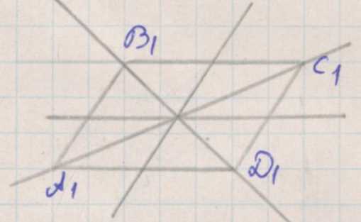 6. Для построения осей симметрии параллелограмма \( A_1B_1C_1D_1 \) необходимо провести прямые через середины противоположных сторон: середина \( A_1B_1 \) соединяется с серединой \( C_1D_1 \), а середина \( B_1C_1 \) — с серединой \( D_1A_1 \).