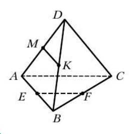 Даны тетраэдр \(ABCD\), точки \(E, F, M, K\) — середины рёбер \(AB, BC, AD, BD\) соответственно.