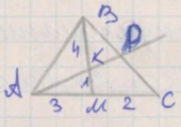 Точка \(M\) делит \(AC\) в отношении \(3:2\), а точка \(K\) делит \(BM\) в отношении \(4:1\).