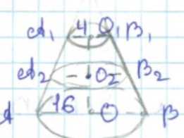 Площади оснований равны 4 и 16, значит радиусы \( r_2 = 2 \), \( r_1 = 4 \).