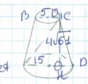 Образующая усечённого конуса \( l \) является гипотенузой прямоугольного треугольника с катетами \( CH \) и радиусом меньшего основания \( KD = 5 \). Тогда \( l = \sqrt{CH^2 + KD^2} = \sqrt{876 + 25} = \sqrt{901} \). По условию и рисунку эта длина равна 26. Наконец, площадь боковой поверхности усечённого конуса вычисляется по формуле \( S = \pi (r + R) l = \pi (5 + 15) \cdot 26 = 520 \pi \).