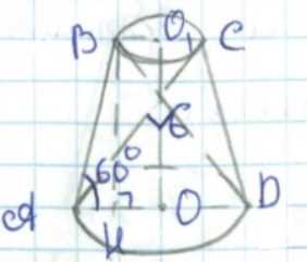 Высота усечённого конуса равна 6 см, а угол между его образующей и плоскостью большего основания составляет 60°. Диагонали осевого сечения усечённого конуса перпендикулярны. Найдите площадь боковой поверхности усечённого конуса.