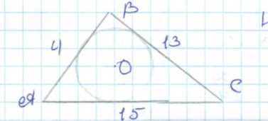 Найдите площадь круга, вписанного в треугольник со сторонами 4 см, 13 см и 15 см.