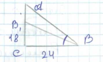 Обозначим точку пересечения биссектрисы с гипотенузой как \(B_1\). Пусть \(CB_1 = x\), тогда оставшийся отрезок \(B_1D = 18 — x\) (где \(D\) — точка на катете). По свойству биссектрисы в треугольнике, отношение отрезков, на которые биссектриса делит сторону, равно отношению соседних сторон: \(\frac{B_1D}{CB_1} = \frac{AB}{AC}\). Подставляем известные значения: \(\frac{18 — x}{30} = \frac{x}{24}\).
